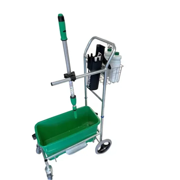 Denne praktiske vogn har plads til en spand, et greb til teleskopskaft, en holder til redskaber samt en lille kurv til sæbe og klude.