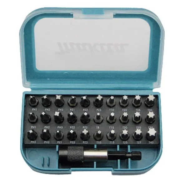 Makita 31 stk. ”standard” bitssæt. Indhold: 25 mm ”standard” bits 2 x PH1, 4 x PH2, 2 x PH3, 2 x PZ1, 4 x PZ2, 2 x PZ3,1 x T8, 2 x T10, 2 x T15, 2 x T20,3 x T25, 1 xT27, 2 x T30, 1 x T40 og en lynskift bitholder.