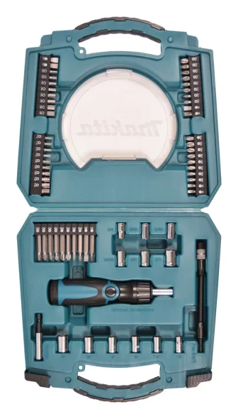 Indeholder : 1 stk skraldeskruetrækker, 12 stk. bitstoppe størrelse 6/7/8/9/10/13-1/4"- 9/32"-5/16"-11/32-3/8"-1/2", 1 stk. magnet bitholder, 39 stk. ass. 25mm bits type lige kærv S4/ S6/ S7, torx T10/T15/T20/T25/T30/T40, Phillips PH0/PH1/PH2/PH3, Pozidrive PZ0/PZ1/PZ2/PZ3, 6 Kant unbraco H3/H4/H5/H6, 10 stk. 50mm ass. bits type S4/S6/PH0/PH1/PH2/PH3/PZ0/PZ1/PZ2/PZ3, 1 stk. flexaksel, 1 stk. 1/4" adapter.