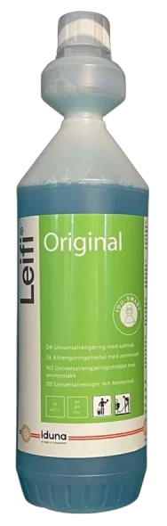 Produktbeskrivelse: Leifi Original er et kraftfuldt og koncentreret universalmiddel, der er ideelt til daglig rengøring af alle vaskbare overflader. Med sin alsidighed kan Leifi anvendes til både hovedrengøring, overfladebehandling og pletfjerning, hvilket gør det til et uundgåeligt valg i miljøer, hvor renlighed er altafgørende, såsom køkkener, detailbutikker, rengøringsselskaber, hoteller, caféer og barer. Leifi Original tørrer hurtigt op uden at efterlade striber, hvilket sikrer, at overfladerne fremstår skinnende rene. Med duft af salmiak og eukalyptus.