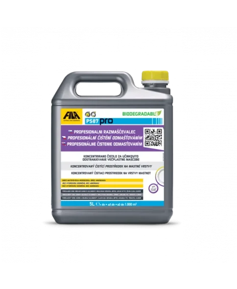 PS87 Pro er en kraftfuld grundrens designet til at tackle selv de mest genstridige pletter og snavs på en bred vifte af overflader. Når produktet fortyndes, kan det effektivt rengøre og affedte meget beskidte gulve af materialer som keramiske fliser, natursten, teglsten og beton. Ufortyndet er PS87 Pro særligt effektiv til at fjerne vanskelige pletter fra keramiske fliser. Det er også ideelt til indledende rengøring af natursten, der ikke tåler syre, og til grundrengøring af cementoverflader. Derudover fungerer PS87 Pro som en voksfjerner til både vandbaseret, metalliseret og polervoks samt forbehandlingsrester fra blankpolerede keramiske fliser.
