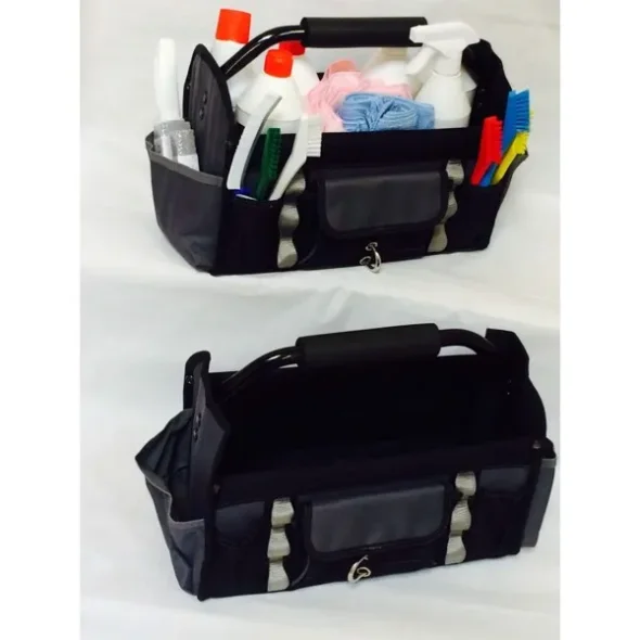 Mange bruger en spand til opbevarelse af rengøringsmidler, - det tager tid at tømme den før en opgave skal løses, desuden er der risiko for rengøringsmidler kan løbe lidt ud og skade den overflade man stiller dem på. Rengøringstasken er desuden praktisk på arbejdspladser hvor kontorene, toiletterne eller køkkenerne ligger langt fra hinanden, det er ofte nemmere lige at gribe en taske end at køre med en rengøringsvogn. (Tasken sælges uden indhold) Udover det store rum hvor du kan have op til 8 flasker rengøringsmidler er tasken udstyret med 2 sidelommer, samt en lille lomme der kan lukkes. Bunden af tasken er udstyret med skridsikre gummidupper.