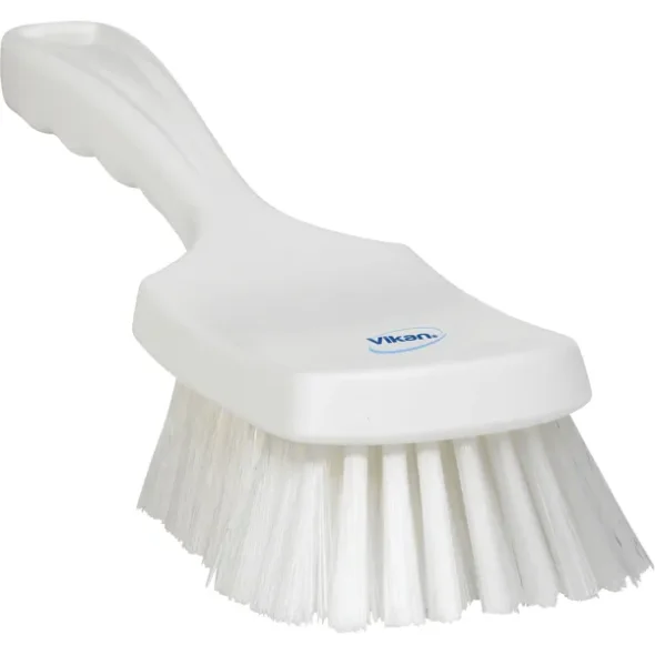 Medium håndbørste 24 cm. Velegnet i fødevareindustrien til rengøring af bl.a. over- og underkanter af borde, spande, mandeluger, fodtøj og andet udstyr. Velegnet til farvestyring, så krydskontaminering undgås.