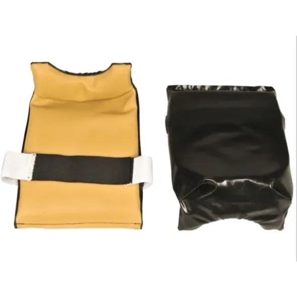 Knæbeskytter med forside af PVC/nylon og bagside af okselæder. Fastgøres med et bånd med velcrolukning.