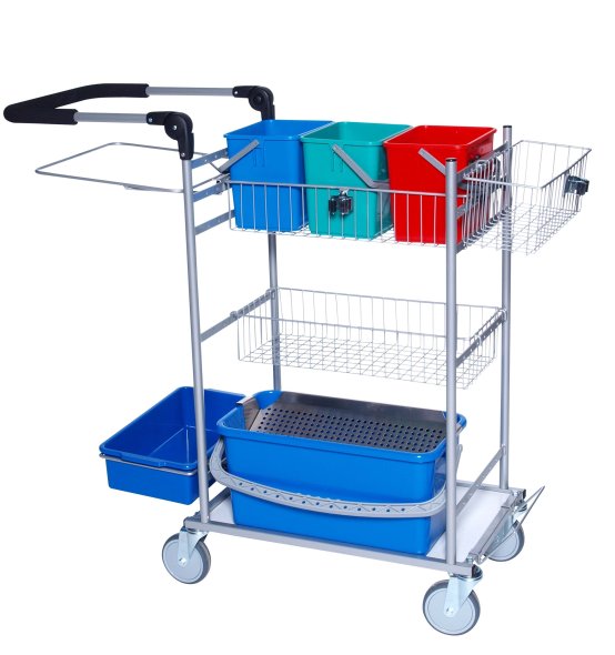 Til vognen medfølger 3 stk 6 liters spand, 1 stk 22 liters spand med dryprist, 1 stk trådkurv til diverse, 1 stk trådkurv med redskabsholder samt 110 liter affaldsstativ med plastbakke som støtte. Desuden medfølger 3 stk. redskabdholder samt 2 stk. mopholder. Vognen leveres med 4 stk 125 mm hjul med kugleleje