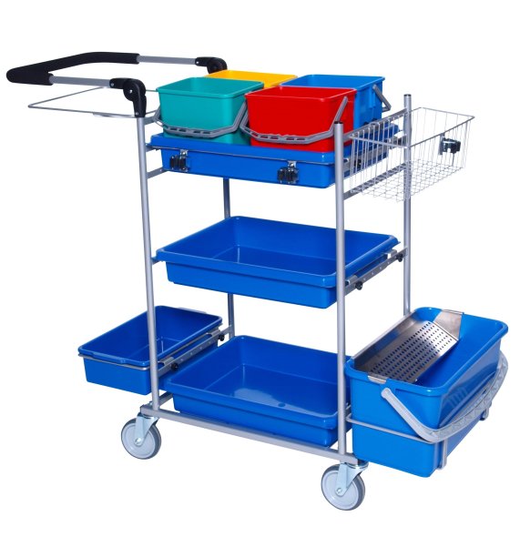 Til vognen medfølger 1 stk. plastbakke hvori der sidder 4 stk. 6 liter spand, 1 stk 22 liter spand med dryprist, 2 stk plastbakker til diverse opbevaring, 1 stk. trådkurv med redskabsholder samt 110 liter affaldsstativ med plastbakke som sækkestøtte. Desuden medfølger 2 stk redskabsholder samt 2 stk mopholder.