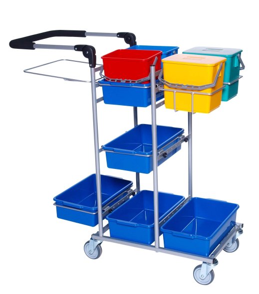 Til vognen medfølger 1 stk. plastbakke med 2 stk 6 liters spand med låg, 2 stk 6 liters spand, 3 stk plastbakker til opbevaring samt 110 liter affaldsstativ med plastbakke som støtte. Desuden medfølger 2 stk. redskabsholder samt 1 stk. mopholder.