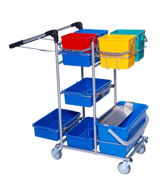 Desuden medfølger 2 stk redskabsholder samt 1 stk mopholder.. Vognen leveres med 4 stk. 100 mm hjul.