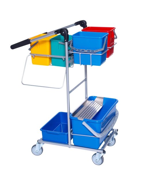 Til vognen medfølger 4 stk 6 liters spand, 22 liter spand med dryprist, 1 stk plastbakke til diverse samt 60 liter affaldsstativ. Desuden medfølger 2 stk redskabsholder samt 1 stk mopholder. Leveres med 4 stk. 100mm hjul.