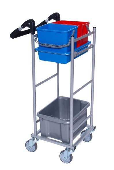 Denne vogn hører under kategorien Ergo Slimline. Med sine 40 x 40 cm på bundrammen fylder vognen minimalt, når håndtaget er foldet ned. Til vognen medfølger 1 stk. plastbakke, hvori der sidder 2 stk. 6 liters spand, samt 1 stk mopbox. Vognen leveres med 4 stk. 100 mm hjul