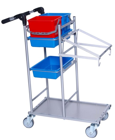 Til vognen medfølger 1 stk plastbakke, hvori der sidder 2 stk. 6 liters spand. Yderligere medfølger 2 stk plastbakke til diverse, 1 stk stort 110 liter affaldsstativ med redskabshold samt 1 stk redskabs- & mopholder.