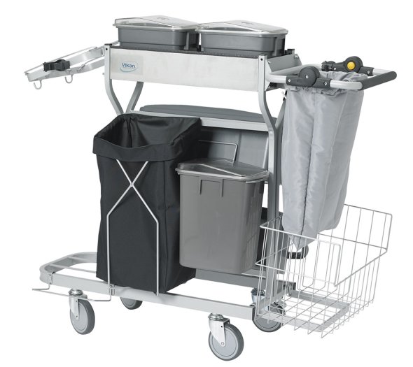 Compact Plus 40 trods en bredde på kun 48 cm bibeholder den stadig en kapacitet på 600 m2, da der er plads til over 20 præparerede mopper samt store mængder papirvarer og sæbe. Med ekstra udstyr kan mængden af mopper og klude fordobles, indeholder også en dobbelt affaldspose.