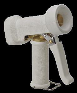 Slagfast pistol, som er velegnet til skylning af gulve og maskiner. Vandmængden kan justeres ved tryk på den gummiisolerede aftrækker. Vandstrålen kan justeres ved hjælp af justereingsskruen i enden af pistolen, så samme vandmængde og spray sikres under arbejdet. Øverst på pistolen er indstøbt en pil, som angiver sprøjteretningen.
