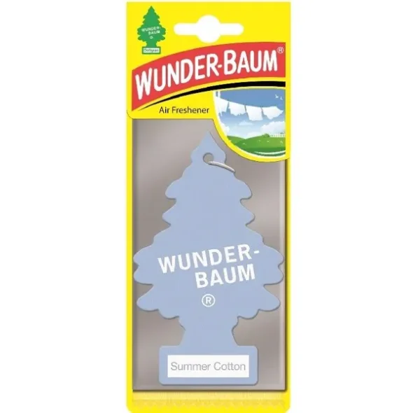 Wunder-Baum bilduft "Summer cotton" duftWunder-Baum er en klassisk luftfrisker, der opfrisker dårlig lugt i bilen, campignvognen, garagen eller lignende. Dufttræerne er pakket ind i plastik og holder derfor på duften, indtil den tages i brug.