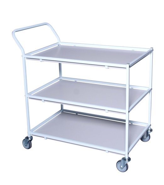 Komplet med: - 3 stk. hylder med slingrekant. - 4 stk. 100 mm hjul.