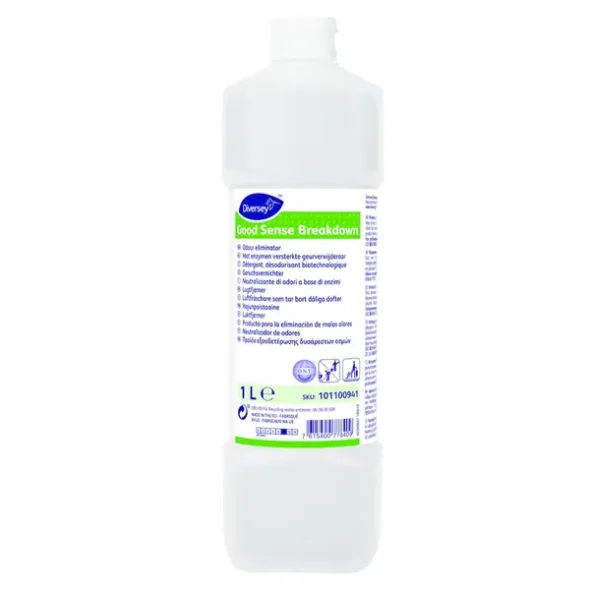 Good Sense BreakDown er en meget effektiv lugtfjerner til daglig brug i urinaler, toiletter, gulvafløb, fuger, affaldsområder og tekstiler. Formuleret med naturlig enzymkultur, samt den neutraliserende O.N.T. teknologi, som fjerner dårlig lugt, og efterlader en behagelig, frisk og langtidsvirkende duft.