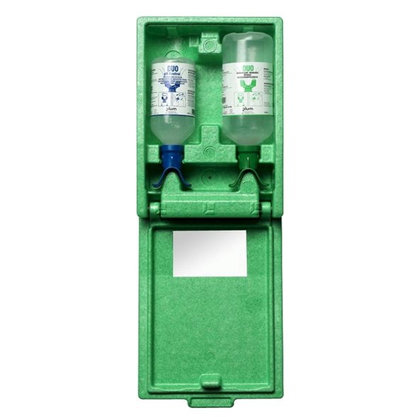 Støvtæt vægstation i slagfast flamingo med 200 ml pH Neutral og 500 ml Plum Øjenskyller. Specielt velegnet til steder hvor der er risiko for ulykker med syrer og baser. Er udstyret med piktogram på fronten og spejl indvendig i låget. Fås også med varmeelement.