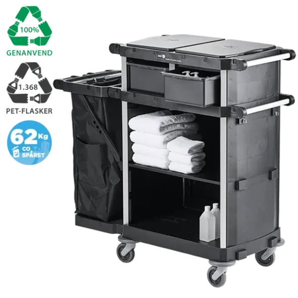 Miljøbevidst, stilren og brugervenlig hotelvogn i NMF’s eksklusive designlinje. Størrelse small. Gennemført vogn til daglig opfyldning og servicering på fx hoteller. Brug den til at transportere linnede, håndklæder, forsyninger eller andre praktiske ting. Mange opbevaringsmuligheder til små og store ting. Funktionelt opbygget – udnyt pladsen maksimalt. Bæreevne: 300 kg. Solid vogn, som kører ubesværet over gulvet og er nemt at styre. Ergonomisk vogn med 180° justerbart kørehåndtag. Konstruktion af aluminium og 2-lags plast med en levetid på min. 10 år. Det stilrene design og bæredygtige materialevalg efterlader et professionelt og miljørigtigt udtryk.