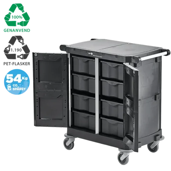 Miljøbevidst, stilren og brugervenlig servicevogn i NMF’s eksklusive designlinje. Størrelse Medium. Gennemført vogn til daglig opfyldning og servicering på fx hoteller. Mange opbevaringsmuligheder til små og store ting. Udnyt pladsen maksimalt – NRT 2.0 er testet til at bære 300 kg. Aluminiumskonstruktion og 2-lagsplast sikrer en levetid på min. 10 år. De store, lydsvage hjul sammen med den solide aluminiumskonstruktion får vognen til at køre ubesværet, og den er nem at styre. Det stilrene design og bæredygtige materialevalg efterlader et professionelt og miljørigtigt udtryk.