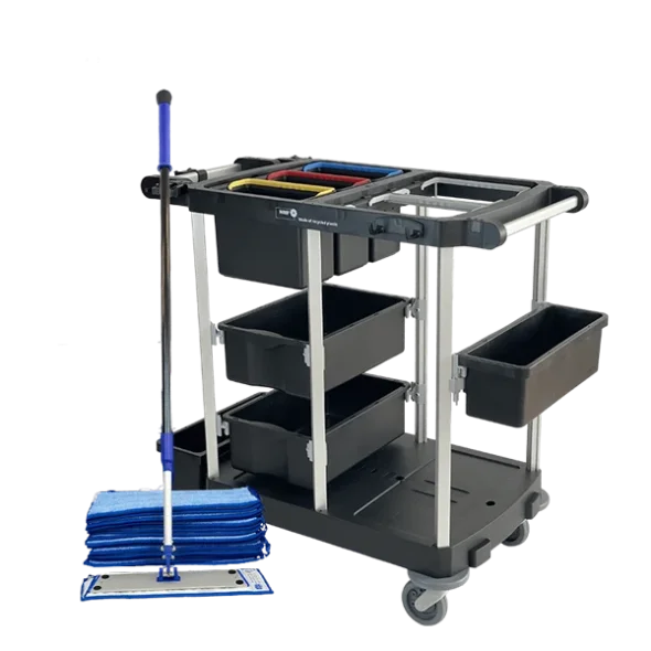 Miljøbevidst, stilren og brugervenlig rengøringsvogn i eksklusiv designlinje. Solid vogn med en bæreevne på 300 kg. Kører ubesværet over gulvet. Ergonomisk vogn med 180° justerbart kørehåndtag. Konstruktion af aluminium og 2-lags plast med en levetid på +10 år. Fleksibel rengøringsvogn, kan ombygges efter behov.