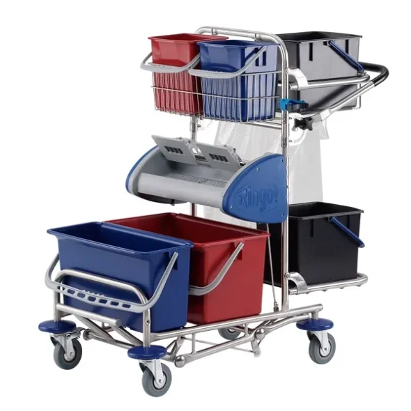 Kompakt rengøringsvogn med masser af plads trods et kompakt design. Højdejusterbar top. Bagerste sækkestativ/spandeholder kan udskiftes med stor åbning til standardsække (70x110 cm). Hvis bagerste spande (10 liter) ikke benyttes, kan sækkestativet fastholde 2 stk. store sække. Som standard er vognen udstyret med 2 stk. 10 liter og 2 stk. 6 liter spande, samt 15 liter og 25 liter gulvaskespand. Rustfrit vognstel. Næsten 100% genanvendelige dele. Bremsehjul.